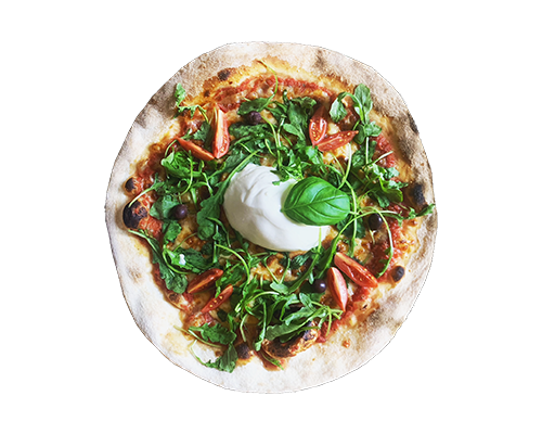 Sauce tomate, mozzarella, roquette, burrata 180g, basilic frais, tomates cerises, crème de balsamique, olives