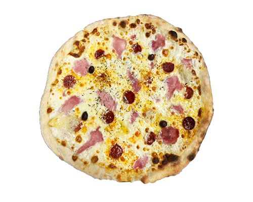 Crème fraîche, mozzarella, jambon, gorgonzola, chorizo, thym, olives