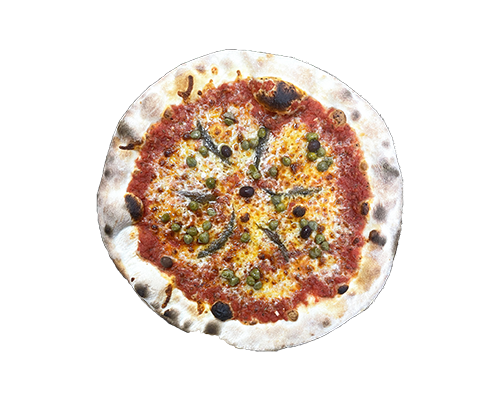 Sauce tomate, mozzarella, anchois, câpres, olives