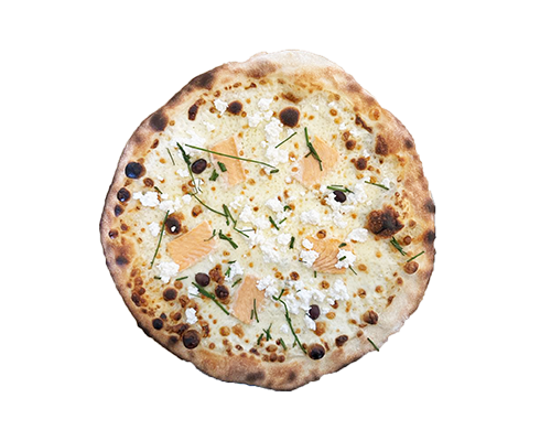 Crème fraîche, mozzarella, saumon sashimi frais, ricotta, ciboulette, zeste de citron vert, olives
