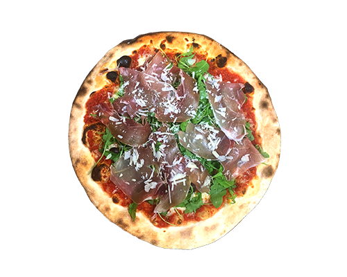 Sauce tomate, mozzarella, roquette, jambon cru, parmesan, olives