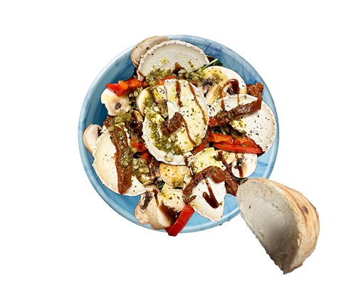 Roquette, tomates séchées, champigons frais, parmesan, chèvre, poivrons, olives