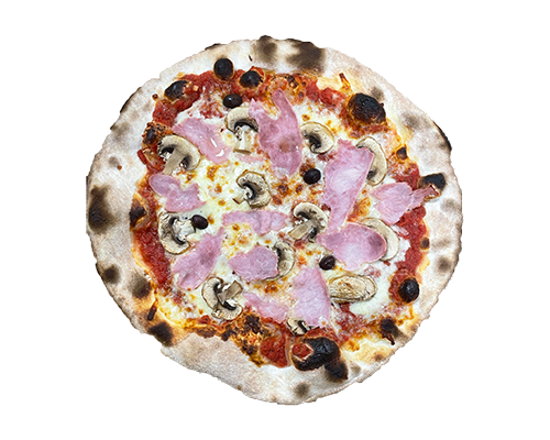 Sauce tomate, mozzarella, jambon, champignons, olives, origan