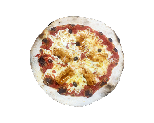 Sauce tomate, mozzarella, saumon sashimi frais, marinade teriyaki, olives
