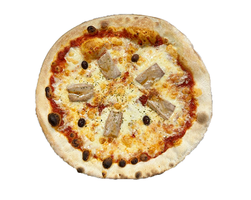 Sauce tomate, mozzarella, thon sashimi frais, marinade teriyaki, olives