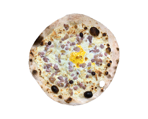 Sauce tomate, chèvre râpé, lardons, oeuf, olives