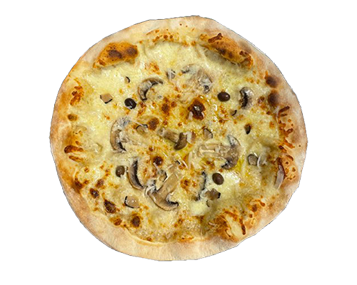 Crème de truffe blanche, mozzarella, copeaux de truffes, champignons, parmesan, olives