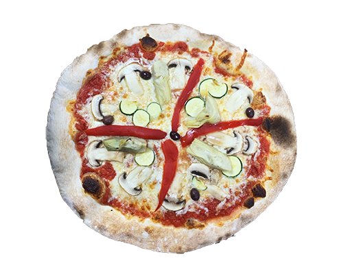 Sauce tomate, mozzarella, poivrons rouges, courgettes, champignons, herbes de provence, olives