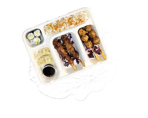 2 brochettes yakitori, 2 brochettes tsukune, 3 makis avocat cheese, 2 gyozas poulet, 1 portion de riz