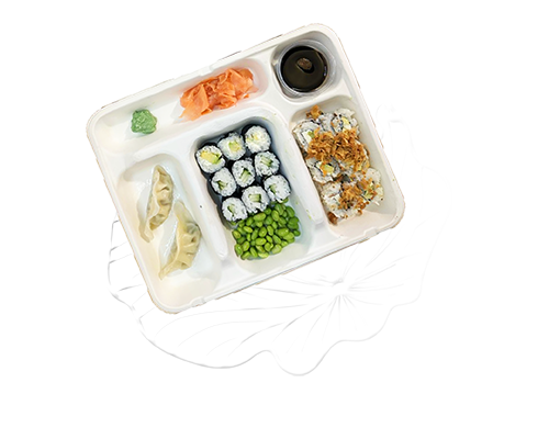 6 rolls avocat cheese oignons frits, 6 makis concombre, 6 makis avocat cheese, 2 gyozas légumes, 1 portion d'edamame