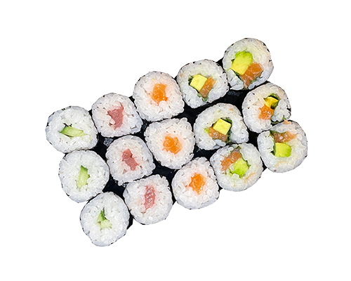 3 makis saumon, 3 makis thon, 3 makis concombre, 6 makis saumon avocat menthe+ 1 accompagnement inclus