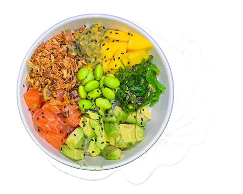 Riz, saumon, wakamé, mangue, fruit de la passion, oignons frits, avocat, sésame