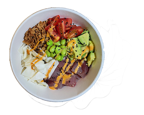 Riz, thon, mayo spicy, avocat, tomates cerises, edamamé, chou blanc, oignons frits, sésame