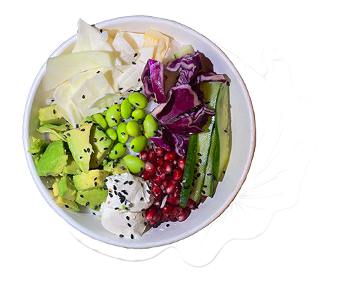 Riz, chou blanc et rouge, edamamé, cheese, grenade, avocat, concombre, sésame