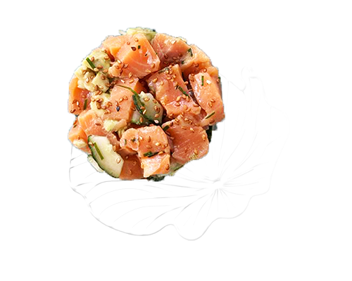 Saumon frais coupé au couteau, avocat, concombre, graines de sésame, sauce citronnée (Ponzu)