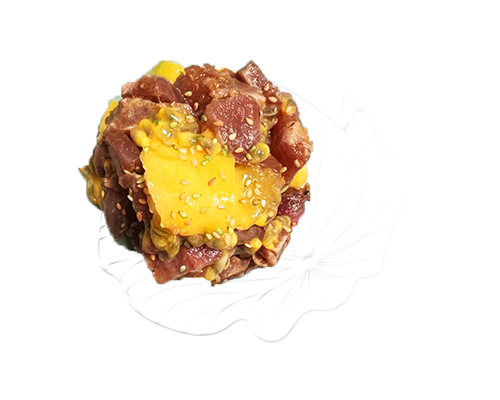 thon mi-cuit sauce teryaki, mangue, fruit de la passion, graines de sésame