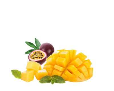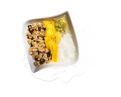 yaourt vanille vegan, muesli choco, mangue, fruit de la passion, noix de coco