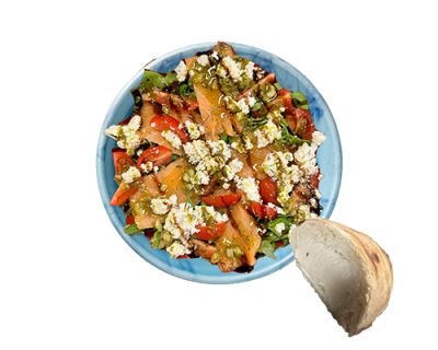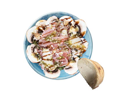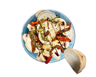Roquette, tomates séchées, champigons frais, parmesan, chèvre, poivrons, olives
