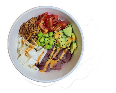 Riz, thon, mayo spicy, avocat, tomates cerises, edamamé, chou blanc,...