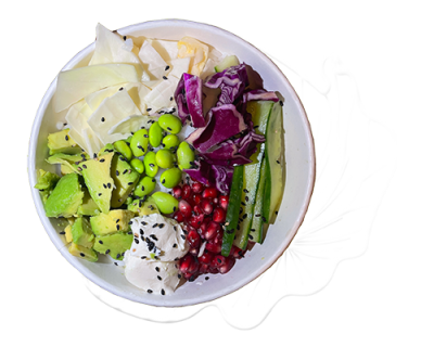 Riz, chou blanc et rouge, edamamé, cheese, grenade, avocat, concombre,...